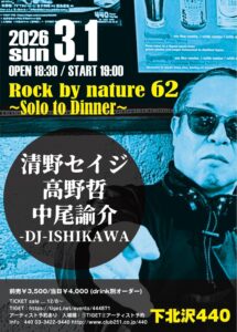 2026年3月1日(日)下北沢440”Rock by nature 62 ~Solo to Dinner~” -LIVE-清野セイジ高野哲中尾諭介-DJ-ISHIKAWA 18:30 open/19:00 start前売